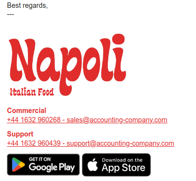 If it’s a restaurant chain, and the company has an app for ordering food. Then, you can use the email signature to encourage installation. See this example with Google Play and App Store badges.