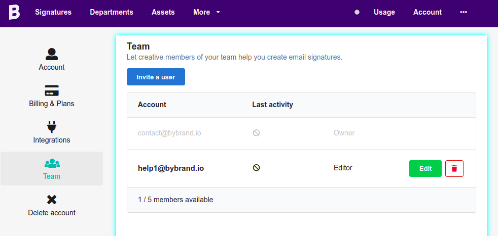 One of the fundamentals of PLG software is: unlock collaboration, and don’t block features that drive engagement and collaboration. So Bybrand now has the Team (collaboration) feature available for everyone. In fact, we want to make it easy to team up with the people who make the job of creating and managing email signatures possible.