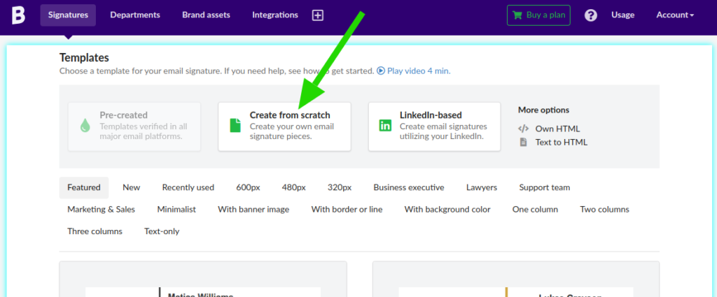 When clicking the button to create an email signature, you can see an option to Create from scratch, or use the direct link on the main dashboard.
