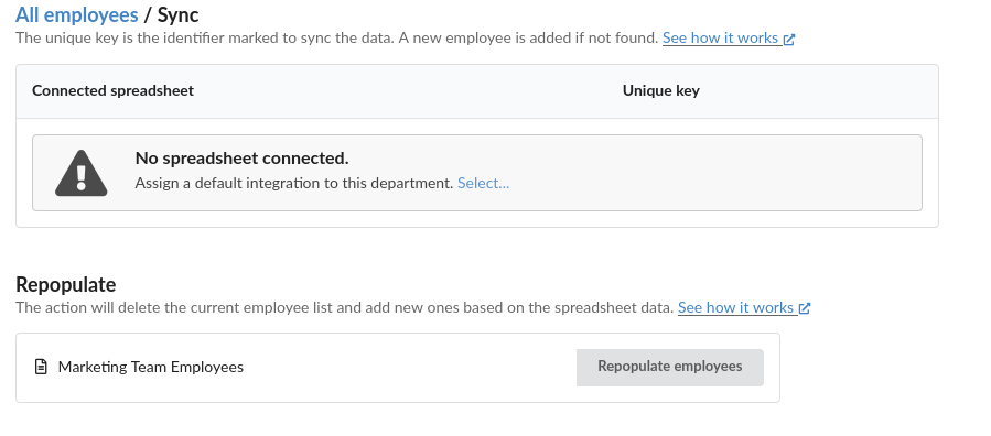 The sync function will update all placeholders and employees’ data based on a unique key you define. Good unique key ideas are, for example, name and email.