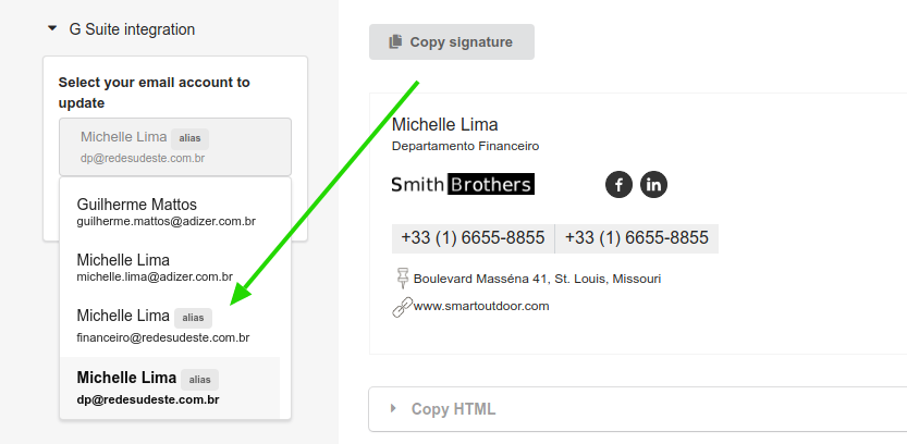 Fazendo todo o processo, agora vem a melhor parte que é atualizar as assinaturas. No área de colar no e-mail, da Bybrand os endereços alias vão aparecer com uma tag.